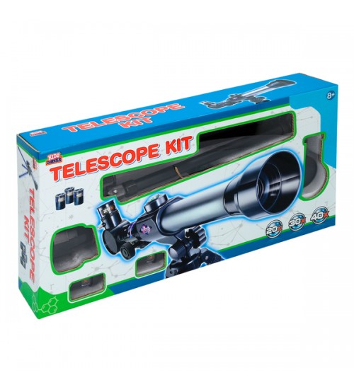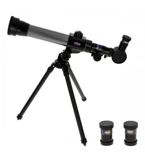 Teleskopa izmēri ir 40,5x31x37,8 cm, un tajā ir 3 palielināmās lēcas - 20x, 30x un 40x. Rotaļlietai ir arī statīvs ar kompasu, skatu meklētājs un tā var griezties par 360º.