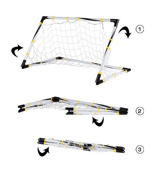 - 100x70x70 cm salokāmie futbola vārti, kas salokās 3 vienkāršos soļos un kuros iekļauta instrukcija pareizai montāžai.