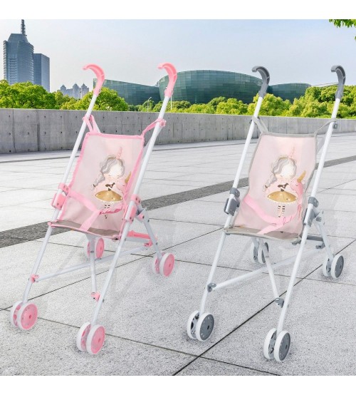 Ieteicamais vecums šiem saliekamajiem rotaļu ratiņiem ir no 3 gadu vecuma, un tie veicina lomu spēles, iztēli un rupjo motoriku. Salokāms lietussarga stila rotaļu krēsls 2 krāsās: rozā vai pelēkā (krāsa nejauša).