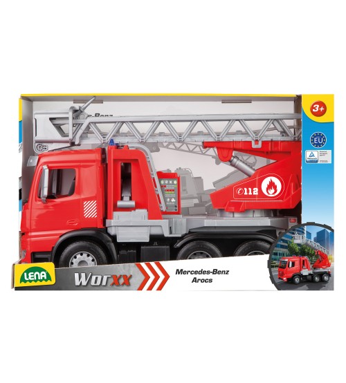 LENA® WORXX kāpņu ugunsdzēsēju mašīna Mercedes Arocs ir reālistiska oriģināla transportlīdzekļa kopija. Pateicoties tā izturīgajam dizainam ar 6 mm cinkota tērauda asīm, 48 cm garš 3 asu transportlīdzeklis ir piemērots ikvienam spēles piedzīvojumam neatkarīgi no tā, vai tas notiek iekšpusē vai ārpusē.