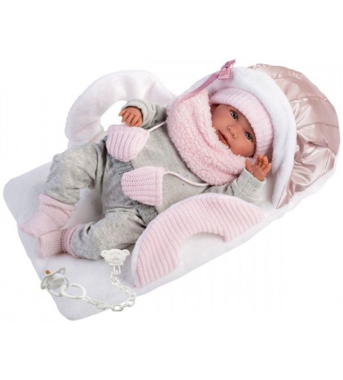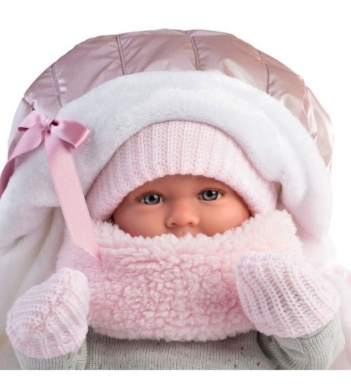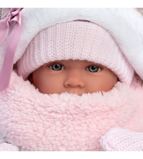 Lelle zīdainis Mimi 42 cm (pārnes. soma, raud, runā, ar mānekli, mīkstais ķermenis) Spānija LL74004