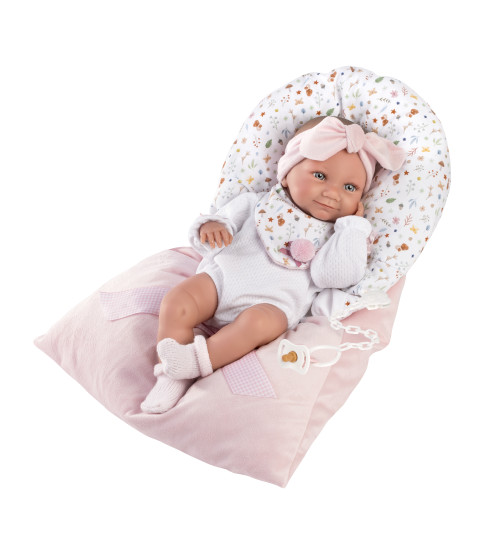 Lelle zīdainis Mimi 42 cm (pārnes. soma, raud, runā, ar mānekli, mīkstais ķermenis) Spānija LL74004