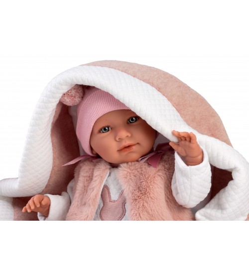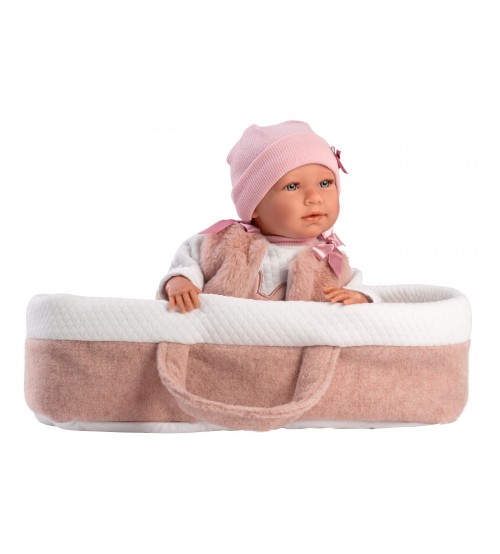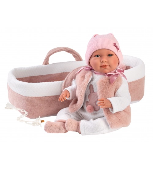 Lelle zīdainis Mimi 42 cm (pārnes. soma, raud, runā, ar mānekli, mīkstais ķermenis) Spānija LL74012