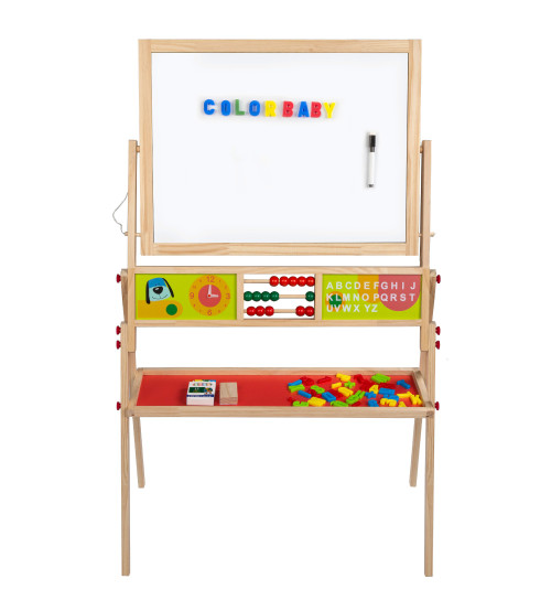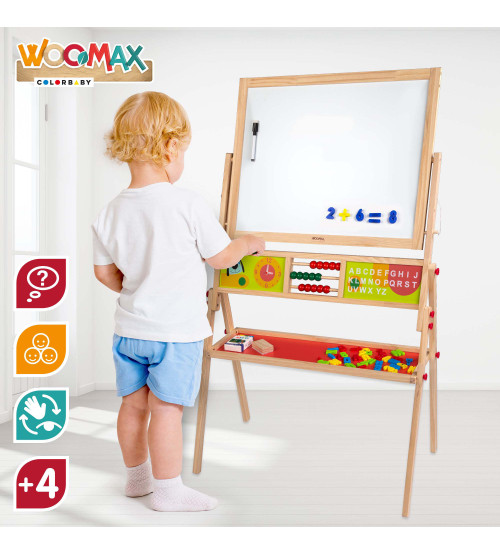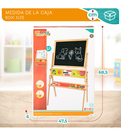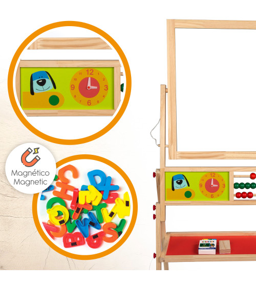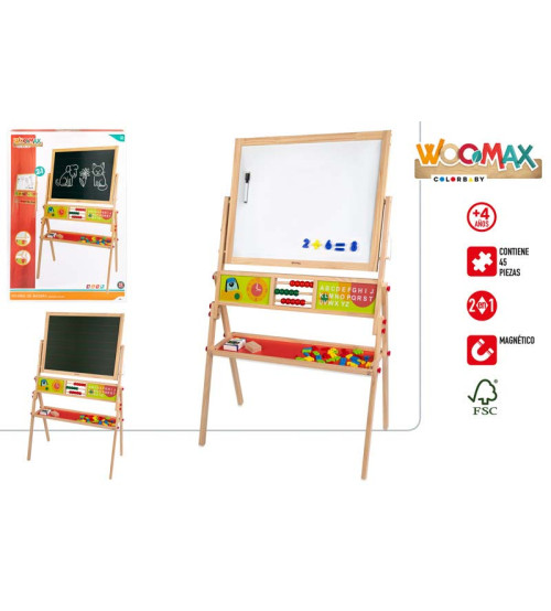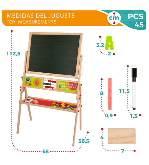 Šai WOOMAX tāfelei divi vienā ir daudz piederumu, lai mācītos būtu visjautrākajā veidā. Un tas ir izgatavots arī no 100% bioloģiski noārdāmas koksnes! Krāsojiet ar marķieri un novietojiet magnētus uz magnētiskās tāfeles vai zīmējiet ar krītu uz granīta tāfeles. Ietver magnētiskos burtus, ciparus un simbolus, 1 alfabētu, 1 abacus un 1 pulksteņa rādītājus. Tam ir kājas un paplāte piederumu uzglabāšanai. Ieteicams bērniem no 4 gadu vecuma. Tā ir rotaļlieta, kas piešķirta iniciatīvai "Kopīgojiet un pārstrādājiet", kas ir Crecer Jugando fonda solidaritātes akcija, kuras mērķis ir savākt rotaļlietas ziedošanai Spānijas labdarības organizācijām. - Lai spēlētu skolotājus mājās, zīmējiet vai iemācieties stundas, burtus un ciparus! - Tāfelei ir 1 melna puse krītam un 1 balta un magnētiska puse. Arī abakuss, pulkstenis un alfabēts. - Iekļauts: 1 krāsaina krīta iepakojums, 1 dzēšgumija, 1 marķieris ar dzēšgumiju kapucē un daudz magnetizētu ciparu, burtu un simbolu. - Attīsta argumentāciju, socializāciju un roku-acu koordināciju. - Ieteicams no 4 gadu vecuma.